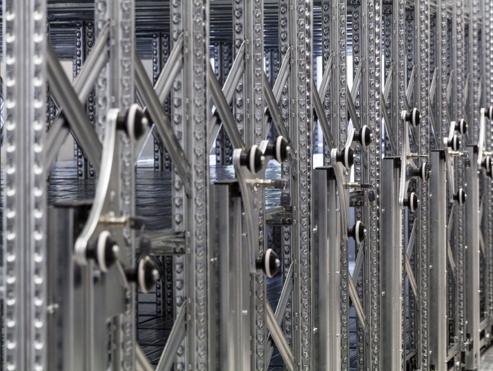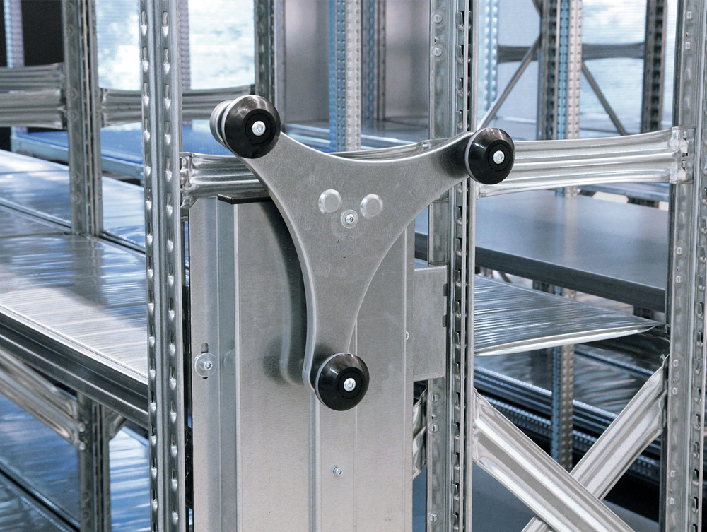 La scaffalatura compattabile consiste in un insieme di scaffalature montate su basi che scorrono lungo dei binari posti perpendicolarmente ai corridoi.